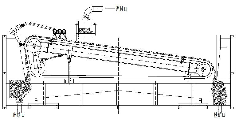平板磁選機采用的帶式分選結構,在整個的工作區域從進料到出料,物料在皮帶的的帶動下,可對物料進行多次的磁攪拌,同時在水流的的沖洗作用下,把不含磁的的尾礦除去,帶有磁性的的礦物被皮帶輸送到板選機的的脫磁區,從而將帶有磁性的的礦物通過脫磁裝置脫掉,來完成選礦的的過程,整機功率小、處理大,磁場強度高,并達到很好的的品質,能夠獲得更大的的效益。